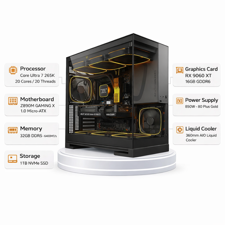 Custom Gaming PC Intel Core Ultra 7 265K, RX 9060 XT 16GB, 32GB DDR5, 1TB NVMe, Windows 11 Pro