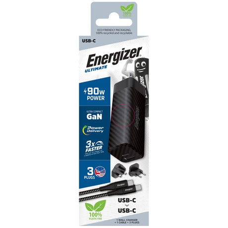 Energizer Ultimate 65W PD/QC Wall Charger with Universal Plug, GaN Technology, Dual Output, , Black