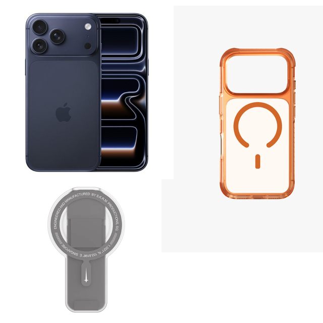 It includes the powerful iPhone 17 Pro Max in Deep Blue, a SkinArma magnetic smart grip-stand for convenience, and a Uniq Hybrid Combat MagSafe case built for strong protection with a bold Volt Orange finish.
