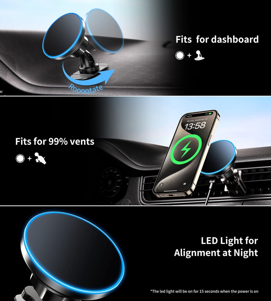 حامل وشاحن سيارة لاسلكي بقوة 15W، مصمّم لتوفير استخدام مريح وثابت أثناء القيادة. بفضل المغناطيسات القوية المتوافقة مع MagSafe، يبقى هاتفك مثبتًا بإحكام حتى على الطرق الوعرة. يدعم الشحن السريع، وزاوية دوران 360 درجة، ويأتي بخياري تركيب على فتحات التكييف أو على الطبلون. مصنوع من مواد متينة لضمان تبديد حرارة ممتاز وأداء ثابت للاستخدام اليومي أو التجاري.