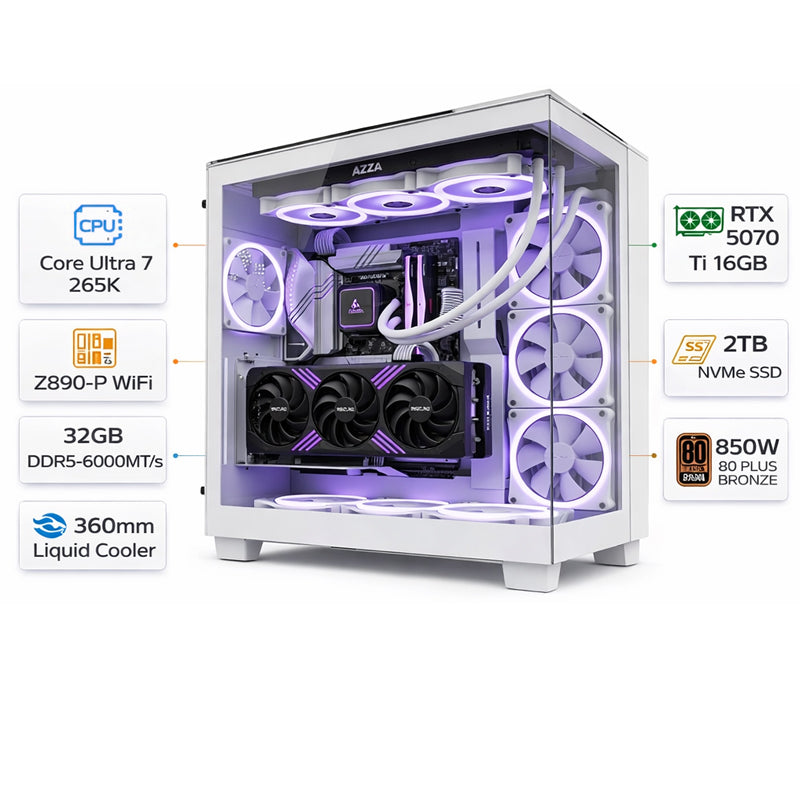صُمم كمبيوتر الألعاب والإنتاجية هذا للمستخدمين الذين يحتاجون إلى أداء قوي، واستجابة سريعة للنظام، ودعم للأجهزة الحديثة. يعمل معالج إنتل كور ألترا ٧ مع كارت شاشة آر تي إكس ٥٠٧٠ تي آي لتشغيل الألعاب المتطلبة وأعباء العمل الإبداعية. تحافظ رامات دي دي آر ٥ و هارد إن في إم إي والمبرد السائل ٣٦٠ مم على استقرار النظام بينما يدعم كيس إن زد إكس تي إتش ٩ إليت تدفق الهواء وإضاءة آر جي بي.