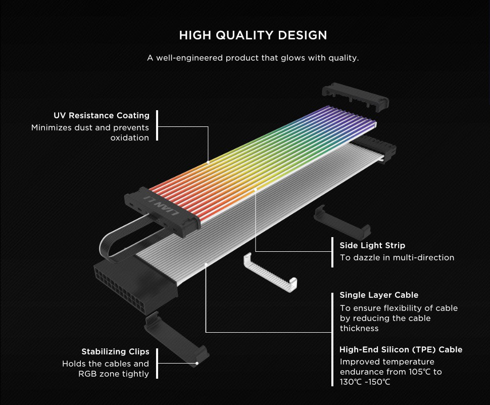 ليان لي ستريمر بلس V2 هو كابل تمديد PSU RGB متميز مصمم لأحدث موصلات طاقة GPU من نوع 12+4 بين (12V-2x6). يضم 8 موجهات ضوئية LED RGB قابلة للعنونة توفر إضاءة نابضة ومستمرة على طول كابل طاقة GPU لإعطاء بناء الكمبيوتر مظهراً نظيفاً ولافتاً بصرياً. متوافق مع برنامج L-Connect 3 ورأس ARGB للوحة الأم، يوفر تخصيصاً كاملاً لتأثيرات الإضاءة مع الحفاظ على بنية كابل مرنة وعالية الجودة. اللمسة النهائية المثالية لأي إعداد توصيل طاقة GPU عالي الأداء.