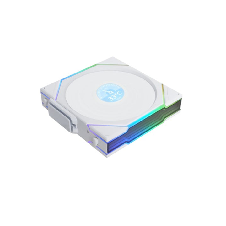 مروحة ليان لي لاسلكية بشفرة عكسية 120مم مع إضاءة ARGB وشاشة LCD 1.6 بوصة (٣ قطع) - أبيض