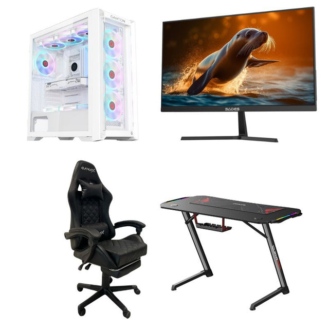 باقة كمبيوتر ألعاب متكاملة – Intel Core i5-14400F، بطاقة RTX 5060 سعة 8 جيجابايت، ذاكرة DDR5 سعة 16 جيجابايت، تخزين NVMe SSD سعة 1 تيرابايت، نظام Windows 11 Pro + شاشة، كرسي وطاولة ألعاب