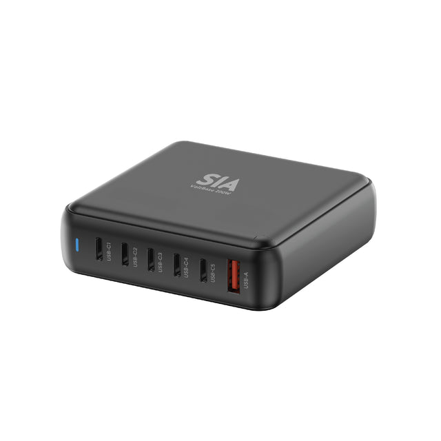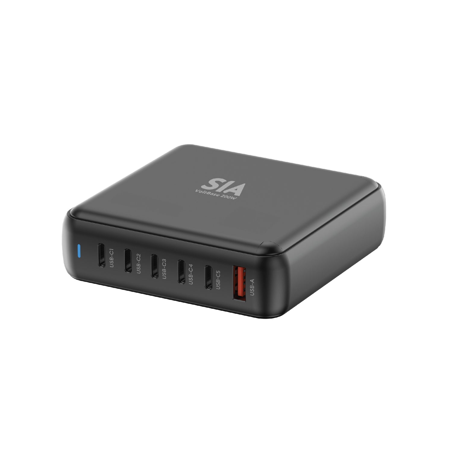 شاحن مكتبي SIA GaN بقدرة 200 واط – 6 منافذ (5 × USB-C + 1 × USB-A) – أسود – بريطانيا