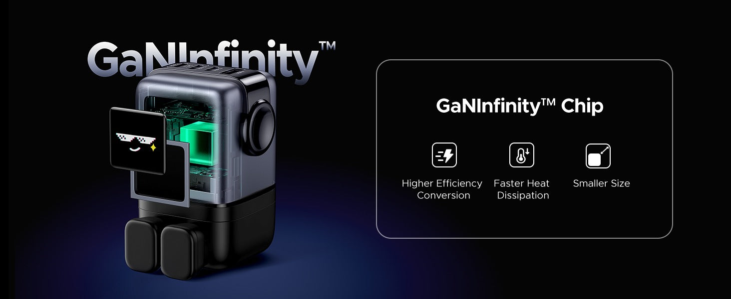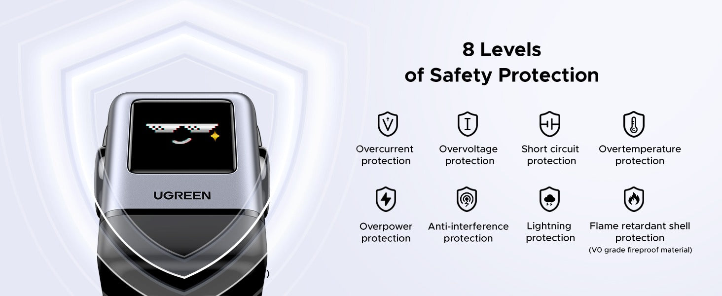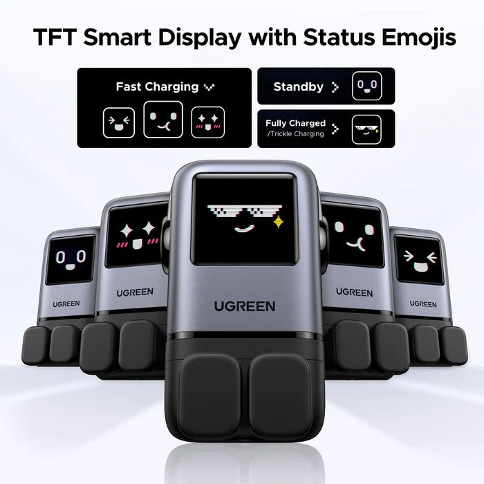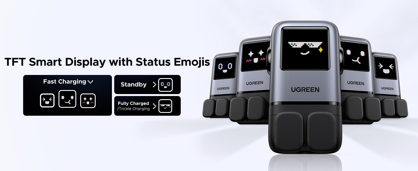 شاحن UGREEN Uno بقوة 100 واط يأتي بتصميم مستوحى من الروبوت ويحتوي على شاشة TFT تعرض وجوه تعبيرية (إيموجي) توضح حالة الشحن. يعتمد على تقنية GaN II لتقديم أداء قوي في حجم مدمج، ويشحن أجهزة اللابتوب، التابلت، الهواتف الذكية وغيرها باستخدام قابس بريطاني واحد.