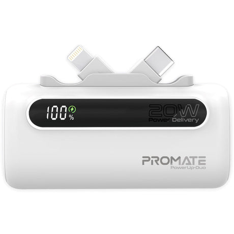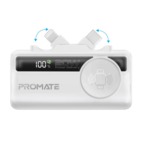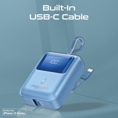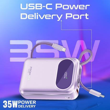 Promate 10000mAh Ultra Compact 35W SuperSpeed Power Bank with Built-In USB-C Cable
