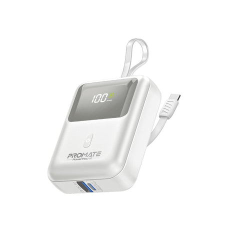 Promate10000mAh Ultra Compact 35W SuperSpeed Power Bank with Built-In USB-C Cable - White