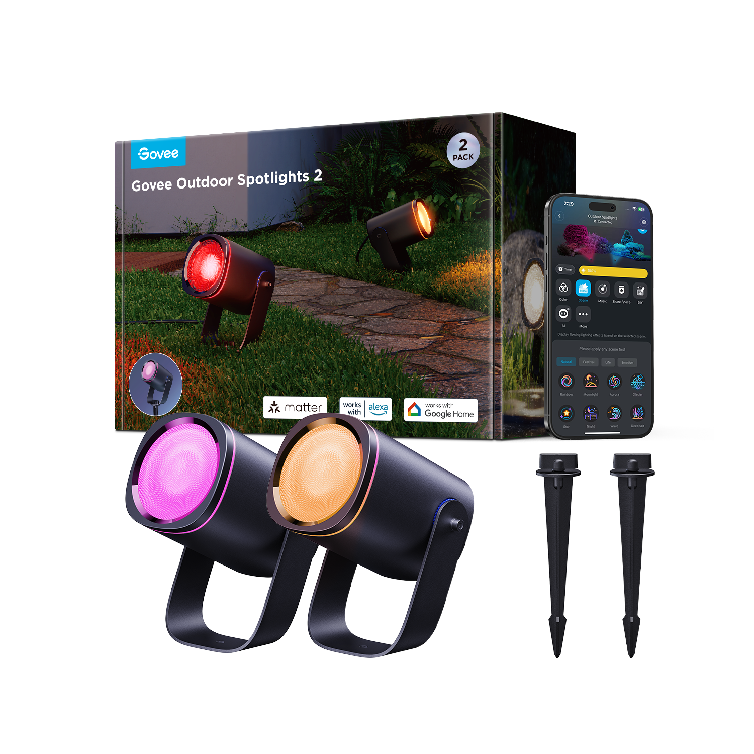 Transform your garden, patio, or outdoor space with the Govee RGBICWW Outdoor Spotlights. Featuring advanced RGBWIC technology, upgraded brightness, and weather-resistant durability, these smart spotlights bring 16 million colors, preset scenes, and dynamic music modes to life. Built with premium aluminum and IP67 waterproof rating, they are designed to withstand rain, heat, and extreme conditions while adding a vibrant atmosphere to any occasion.