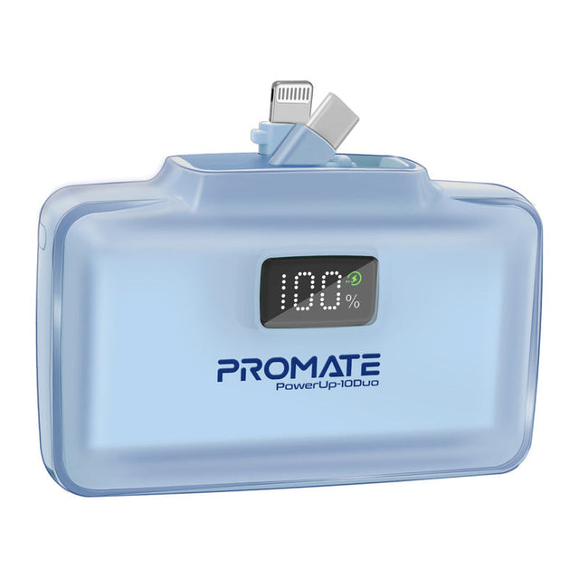 Promate 10000mAh Ultra-Compact fast charging Power Bank with Dual Folding USB-C & Lightning Connector - Blue