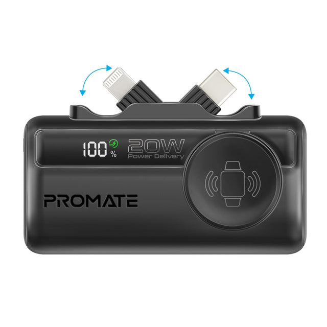 Promate 5000mAh Ultra-Compact fast charging Power Bank with Dual Folding USB-C & Lightning Connector & Apple Watch Charge