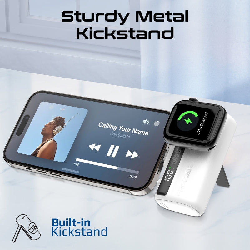 Ultra-compact power bank designed to charge your smartphone and Apple Watch in one device. Features dual folding connectors and fast 20W charging for daily mobile use.
