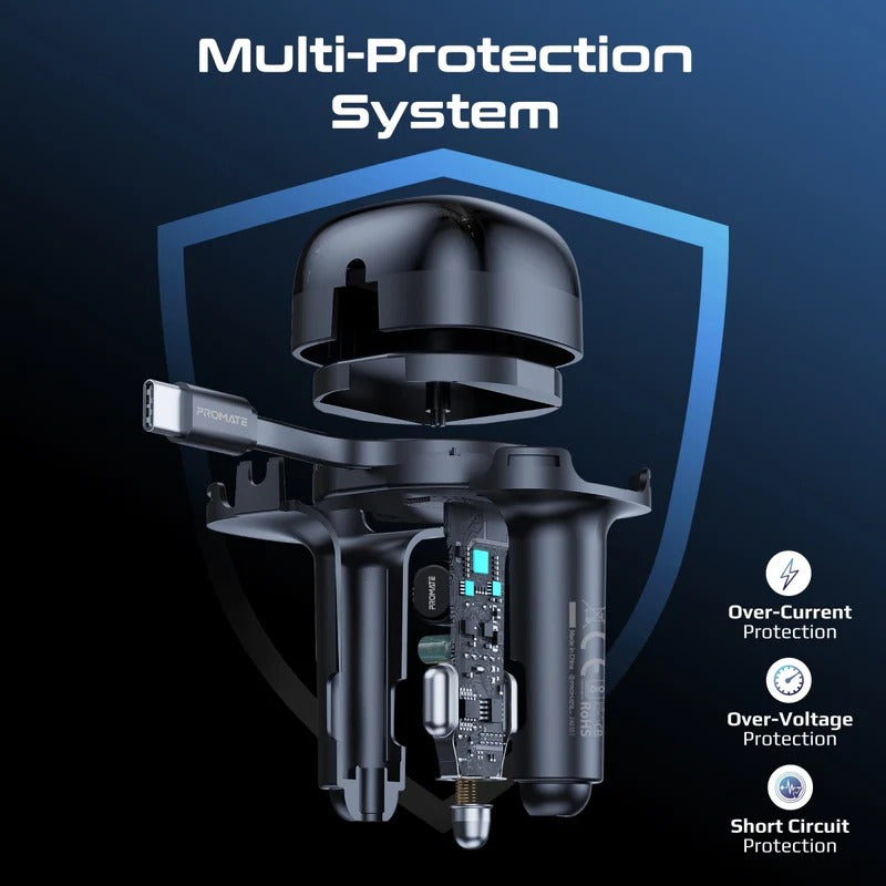 Promate 62W Multi-Port Car Charger with Retractable USB-C Cable - BLACK