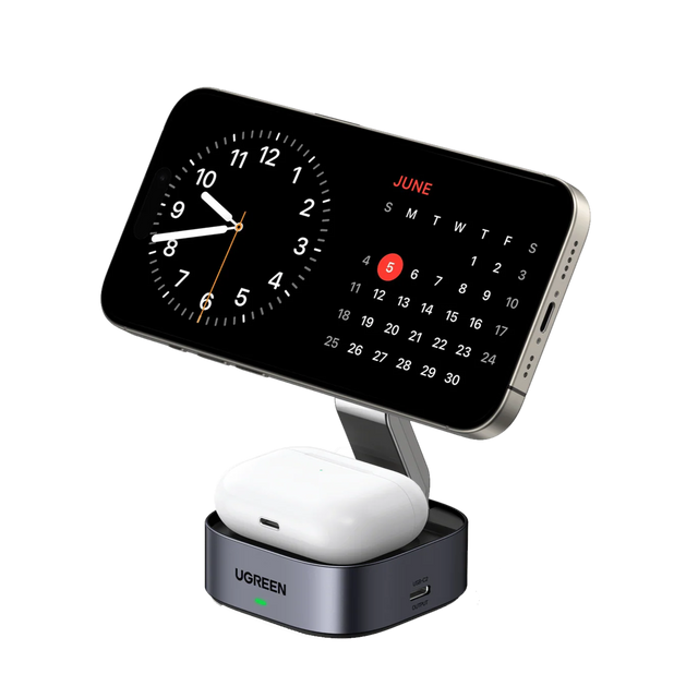 The UGREEN 2‑in‑1 Magnetic Wireless Charger (Model 35278 / W526) is a compact, foldable MagSafe-compatible stand that lets you wirelessly charge your smartphone (7.5 W for iPhone) and TWS earbuds (5 W) simultaneously. Its smart design allows adjustable viewing angles and portability for travel or desk use.